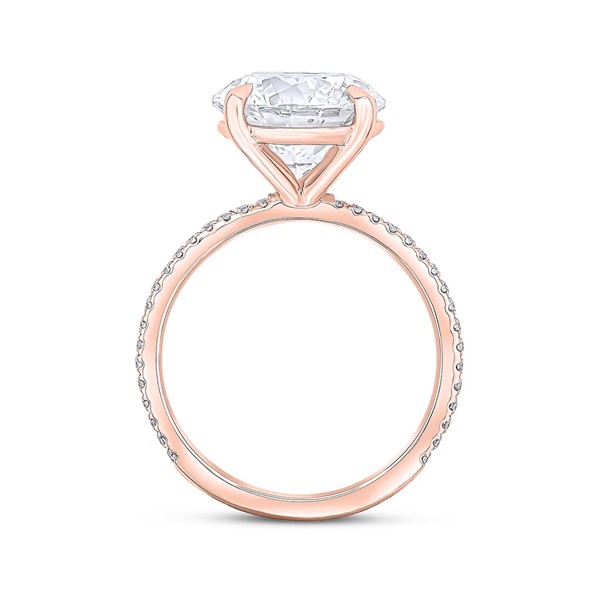 Yes. White diamonds pop against the pink tone. Champagne or peach diamonds blend for a softer look. Sapphires and morganite are popular alternatives.