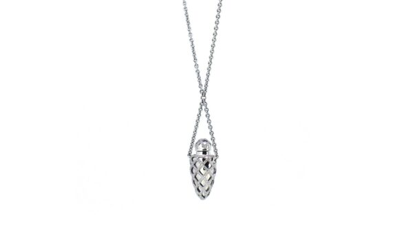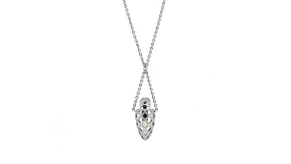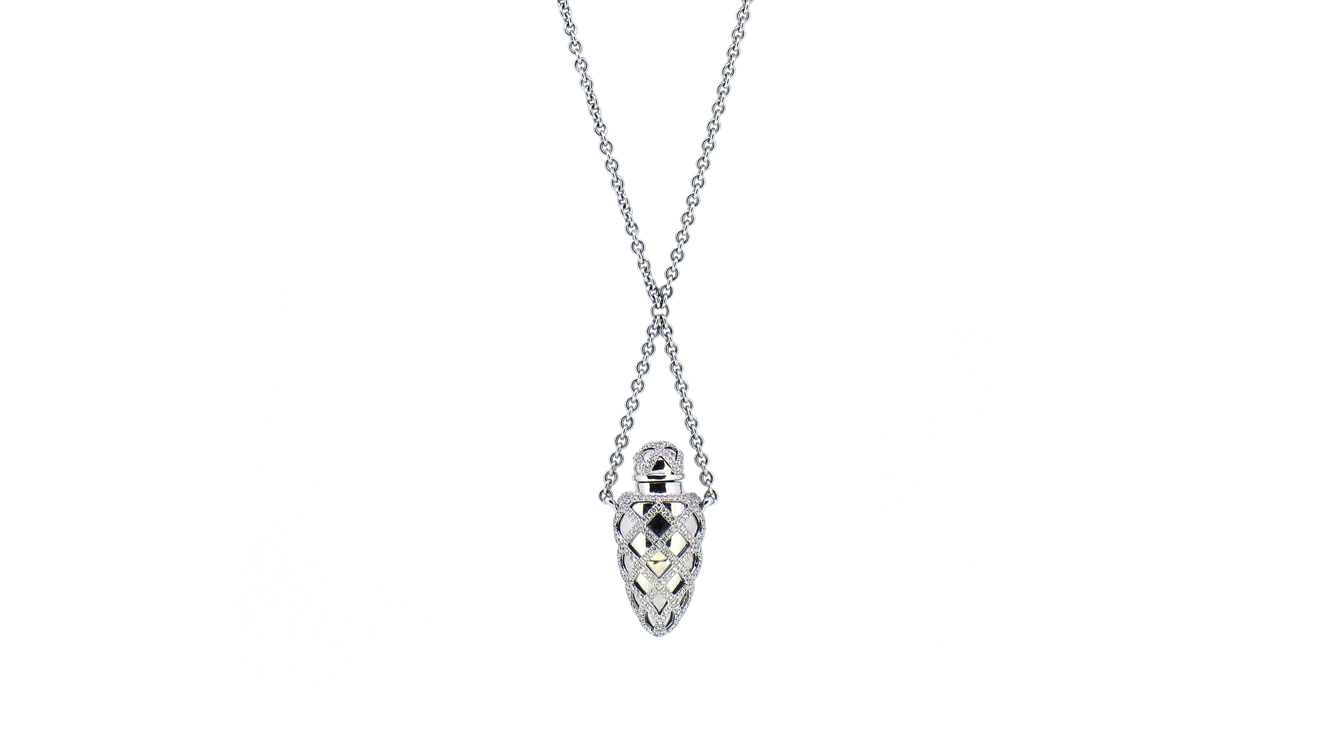 From the celebrated British designer Theo Fennell comes this unique and intricate ampoule pendant. Handcrafted in 18k white gold and pavé set with round brilliant cut diamonds, this playful and luxurious piece makes the perfect gift for someone special. Wear it solo or layered for a more striking look.