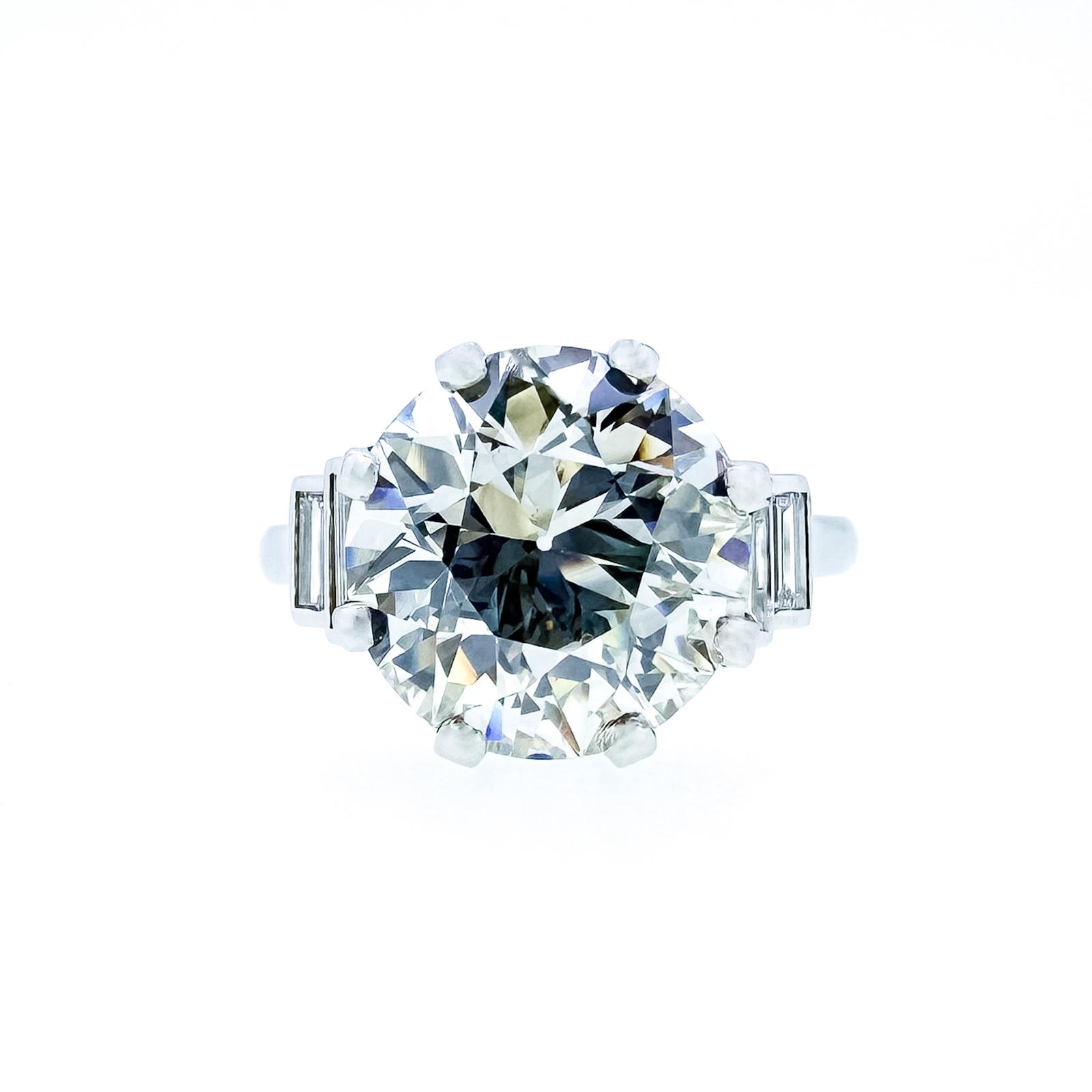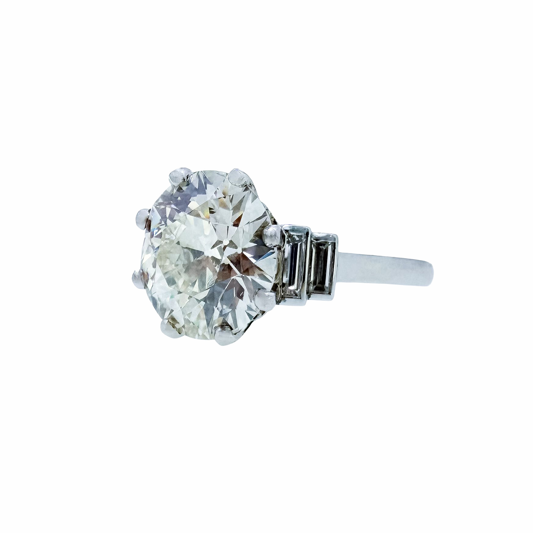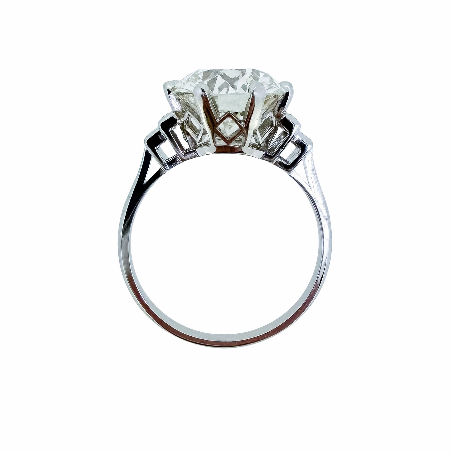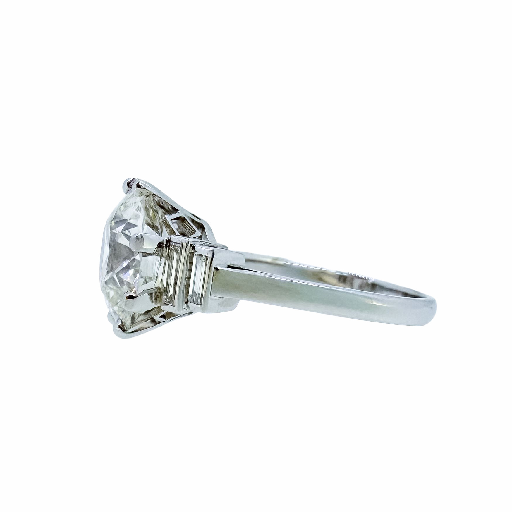 This pre-owned platinum engagement ring from Smith & Green Jewellers features a 3.99ct old cut diamond at its centre, accented by step-down baguette sides totalling 0.80ct. The diamonds display colour K and clarity SI1, and the ring is accompanied by a GIA certificate confirming its authenticity. A refined example of classic craftsmanship from the Smith & Green Pre-Owned Collection.