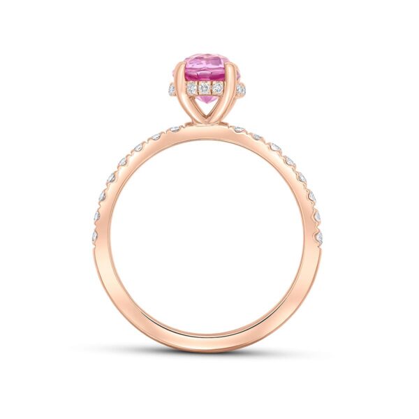 The Harper ring features a delicate yet vivid 1.63ct oval-cut pink sapphire, set in warm 18kt rose gold and accented by a shimmering diamond-set band. Romantic and refined, this piece captures femininity with colour and sparkle in perfect harmony. Ideal for a modern engagement or meaningful gift.