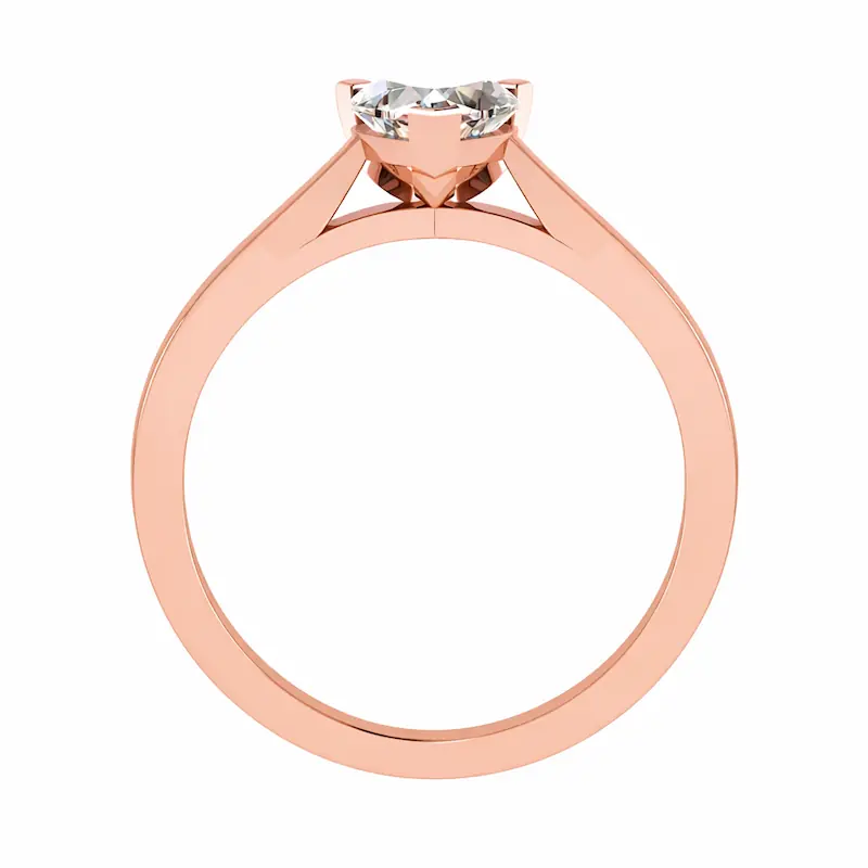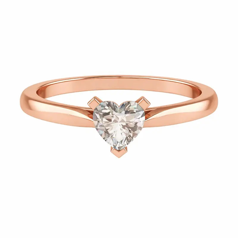 A classic five-prong solitaire with a V-prong at the cleft, prongs on both lobes, and two at the point, letting the heart shape shine on a clean band.