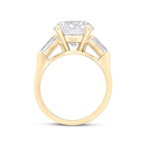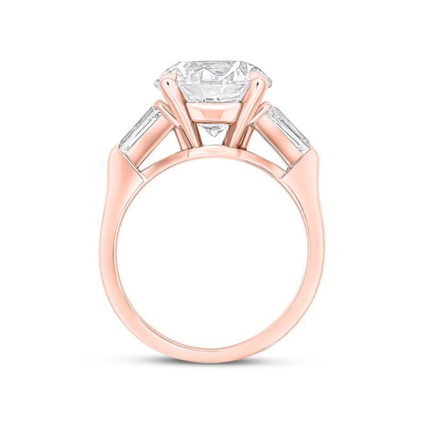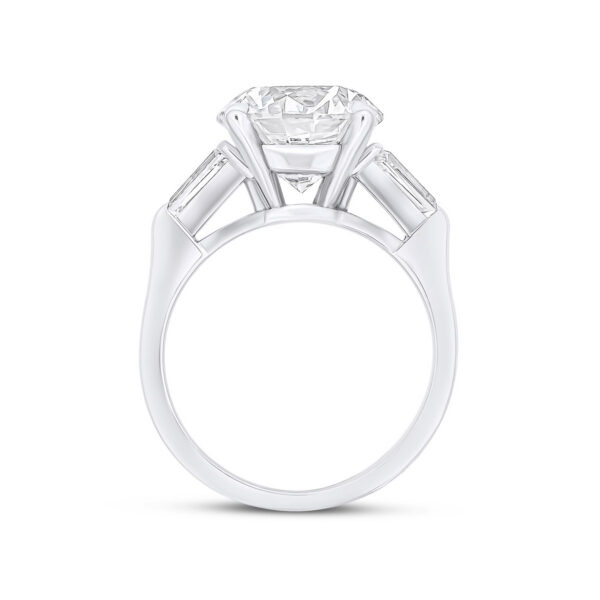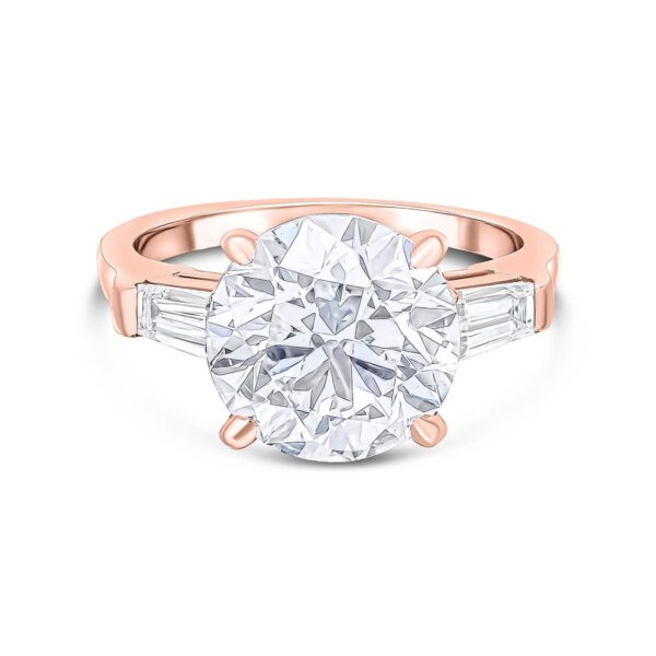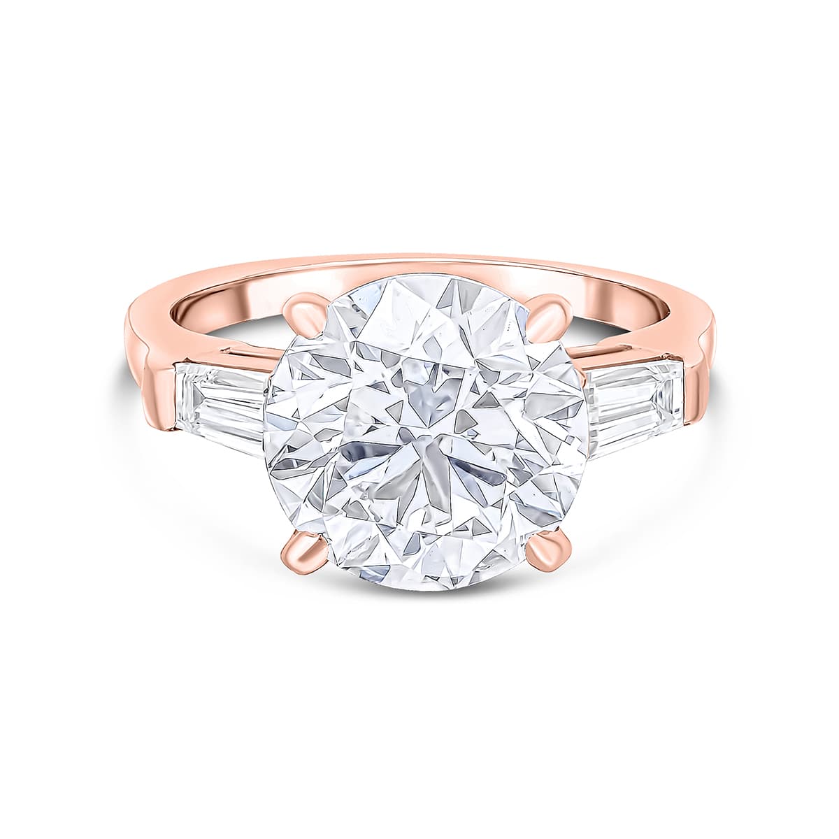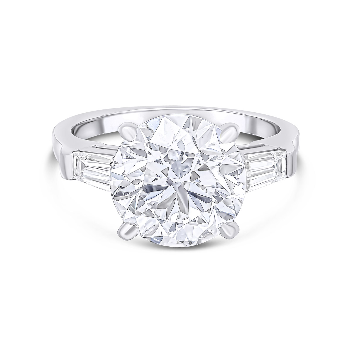 The Modena is a spectacular engagement ring, boasting a remarkable 4.04 carat F/SI2 HRD certified round cut diamond. This ring is the epitome of luxury and elegance. The central diamond is flanked by gracefully tapered baguettes, enhancing its radiant sparkle and giving the ring a refined, sophisticated look. The round cut of the main diamond ensures a brilliant display of light, making it a true showstopper. Designed for those who appreciate the finer things in life, the Modena ring is a symbol of enduring love and commitment, sure to captivate and impress your beloved.