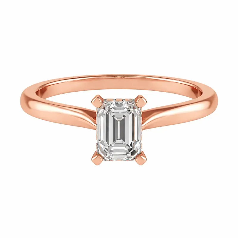 A modern tension-style setting where the emerald-cut stone appears suspended between two open ends of the band with dramatic negative space.