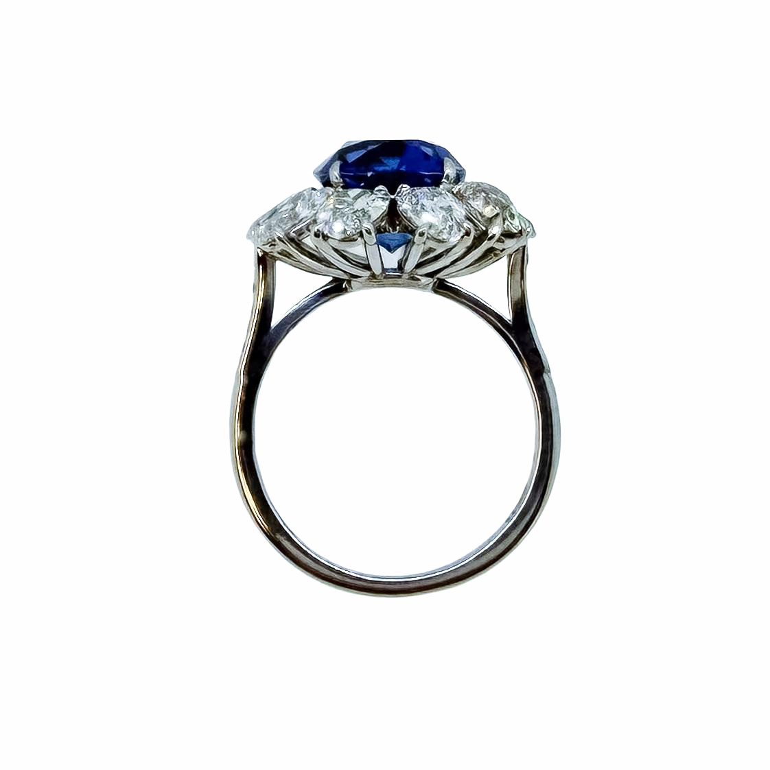 This exquisite piece from the Smith & Green Pre-Owned Collection showcases a 5.04ct Natural Burma Sapphire with No Heat Treatment, certified by GRS. The centre stone is elegantly surrounded by old cut pear shape diamonds, totalling approximately 1.50ct, all set in platinum. The diamonds are of F/G colour and VS clarity, adding refined brilliance to the classic cluster design.