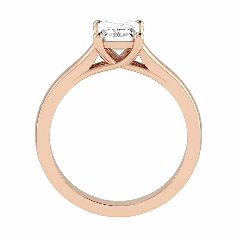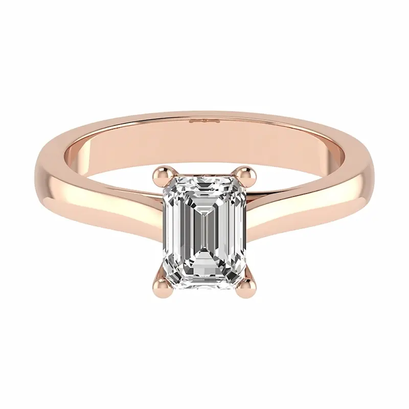 A rectangular halo of baguette and round diamonds surrounding the emerald-cut center with crisp geometric lines and a pave band.