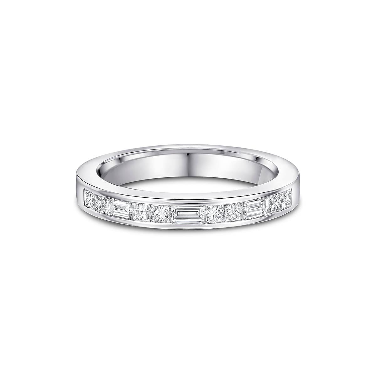 The Zendaya ring captures refined modernity through flawless geometry. Handcrafted in platinum, it features 1.20 ct of G VS emerald-cut diamonds in a sleek channel setting that enhances each stone’s linear brilliance. The clean edges and balanced proportions make it a sophisticated choice for both daily wear and milestone occasions — effortlessly elegant and enduringly contemporary.