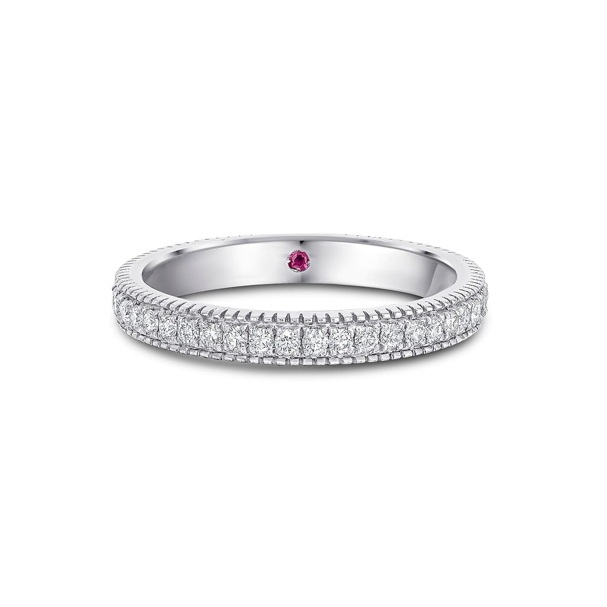 The Ariana ring combines timeless craftsmanship with refined sparkle. Set in platinum, its dual rows of round brilliant diamonds are bordered by elegant milgrain edges for a vintage-inspired finish. A subtle pink sapphire inside the band symbolises love and individuality. With .84 ct G VS diamonds, the Ariana is a graceful statement of enduring beauty — perfect as an eternity or wedding band.