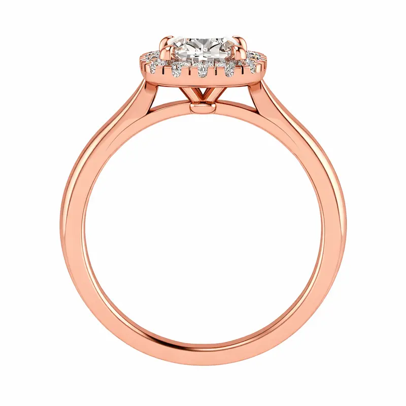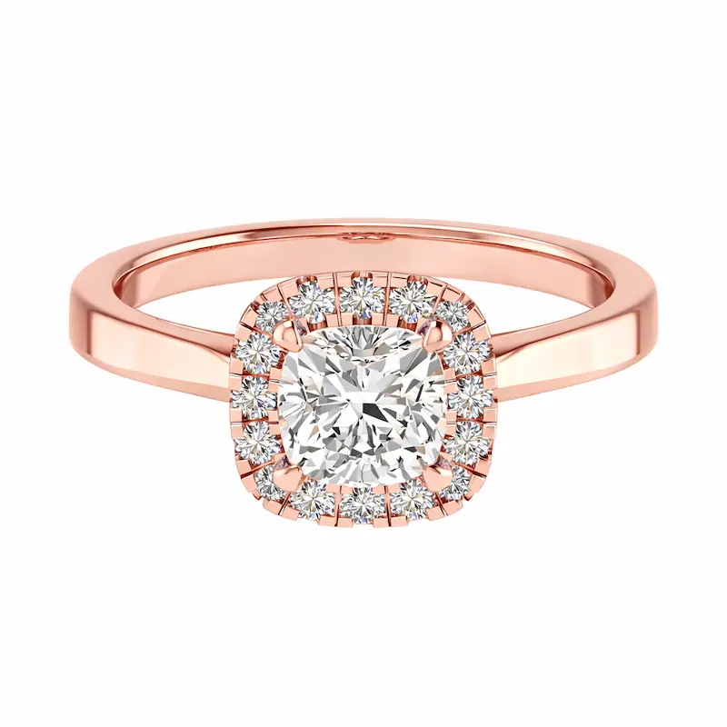 A lavish cluster halo with densely packed round diamonds surrounding the cushion center in a flower-like arrangement on a wide ornate band.
