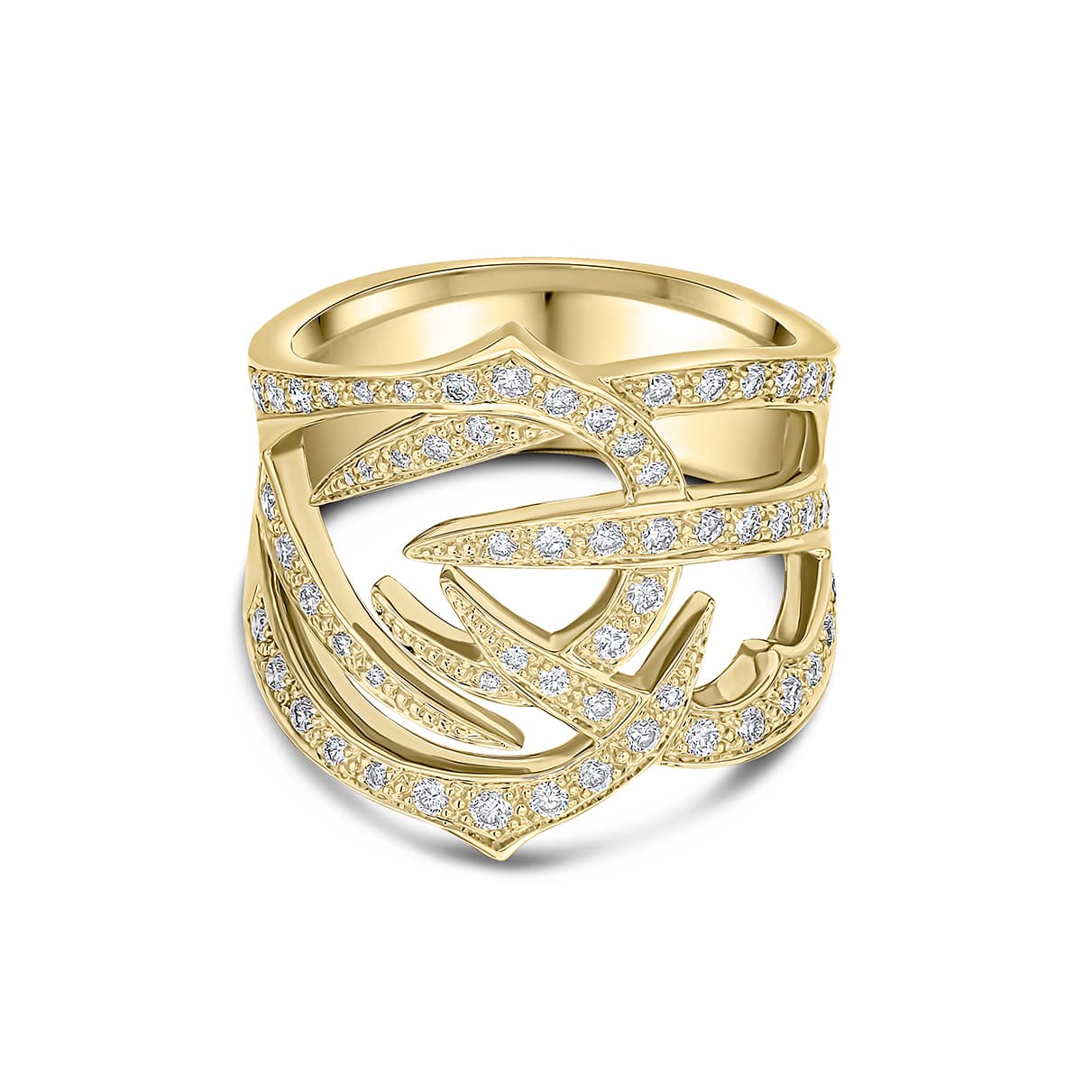 Introducing the exquisite Steven Webster Thorn 0.55ct G VS Dress Ring, a masterpiece of intricate craftsmanship. Fashioned from premium 18k yellow gold or rose gold, this ring features a captivating design where multiple bands weave seamlessly over and under each other, presenting a mesmerising, fluid visual effect. The bands are meticulously lined with a constellation of small, round-cut diamonds, ensuring a luxurious sparkle from every angle. This sophisticated piece is a testament to refined artistry, making it a must-have for any high-end jewellery collection. With its dynamic appearance and dazzling diamonds, the “Thron” Ring is not just a piece of jewellery. Offered exclusively by Smith & Green Jewellers, the “Thron” Ring is a declaration of refined elegance and unparalleled luxury.